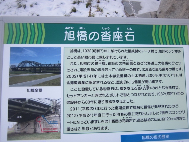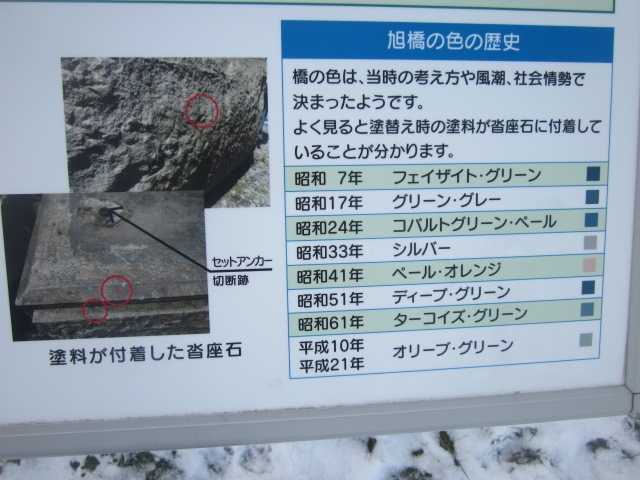 交換後はこの古い沓座石が河畔に移設展示されるようになり、ここには橋の塗り直しの際にこぼれた塗装の一部が残されていたりして、その歴史を肌で感じることが出来ますので、是非、ご覧になってみて下さい。