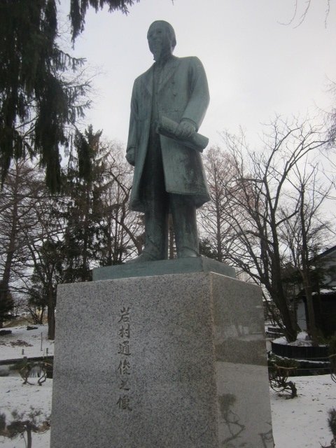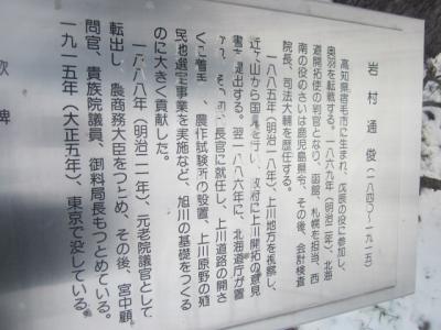 北海道開拓時代に大きな尽力をした岩村通俊の銅像と歌碑が、旭川市内の常磐公園内にあることはあまり知られていないかもしれません。常磐公園の人物像としては、入口にある永山武四郎のものが有名だと思いますが、岩村氏の像に関しては、あちらよりも小さくて、しかも上川神社頓宮の裏手の目立たない場所にありますので、地元でも存在を知らないという方が多いのは少々不遇に感じてしまいます。