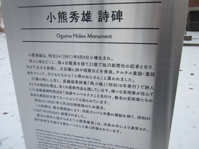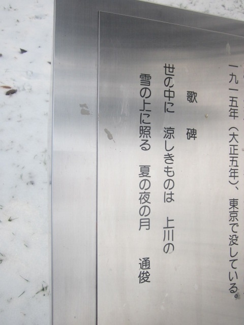 銅像と共に付されている歌碑が、氏の自筆を象った素晴らしいデザインになっていますので、こちらも是非ご注目下さい。氏が上川の地で詠んだ歌の内容も、なかなか素晴らしいなと思いました。- 旅行時期