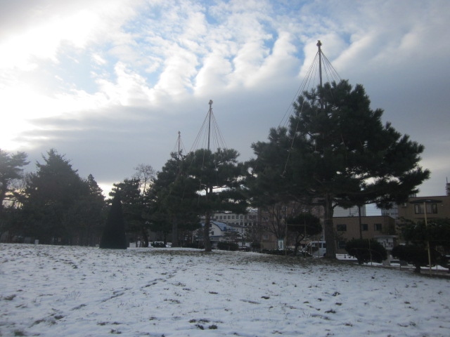今までは作品そのものにばかり注目していましたが、よく見ると隣接する箇所に松の木が並んでいて、ここがそれぞれ雪吊りされている光景がとても美しかったです。