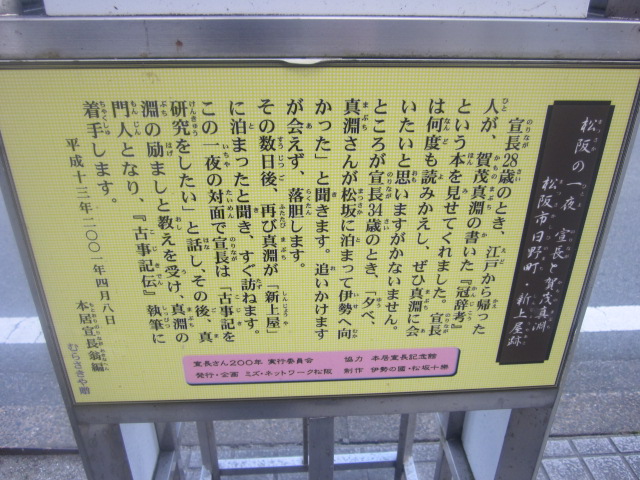 JR・近鉄の松阪駅からは、駅前通りを直進して3つ目の信号角にありますので、立地的には便利なスポットです。詳細は既に他の方が記されている通りですので、割愛させて頂きますが、日本史の教科書でもお馴染みの賀茂真淵と本居宣長の大物二人が対面した場所の跡地として、歴史的な意義を感じるのには良いスポットです。