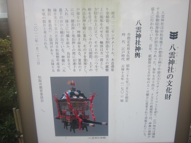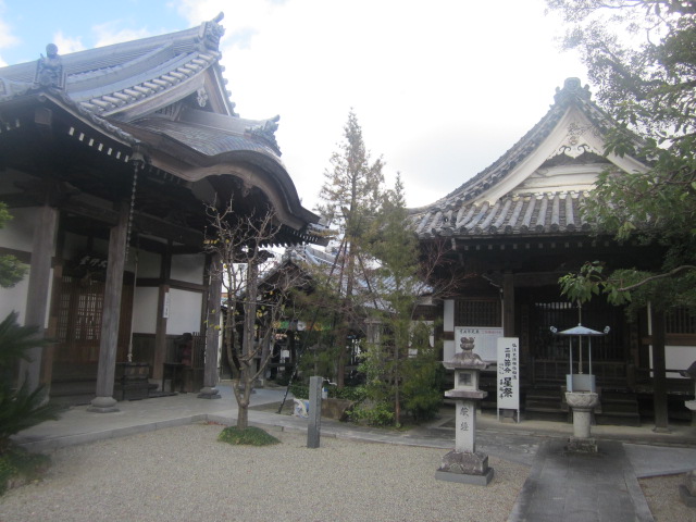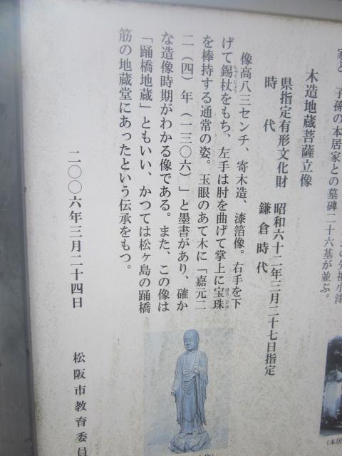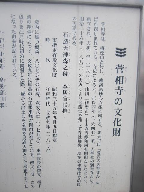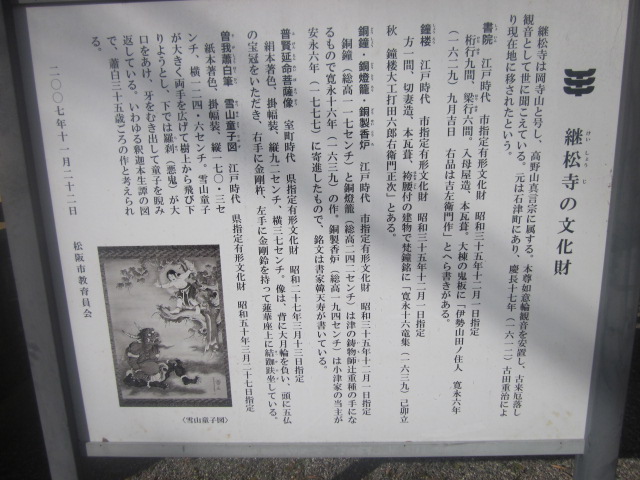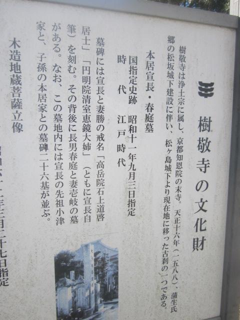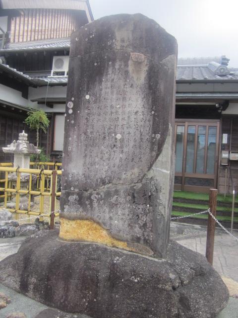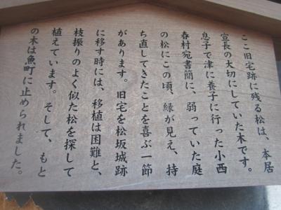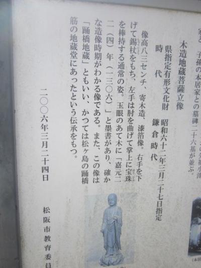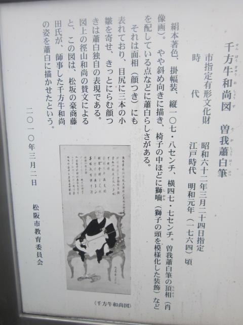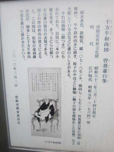 松阪駅から見ると南東方向、小津安二郎青春館のすぐ傍にあるお寺です。本堂前には普通に車が駐車されていたりして、あまり観光客向けの配慮はされていないように感じるお寺でしたが、寺前の案内板を読んでいると、本居宣長の撰文が刻まれた貴重な石碑があるとのことで、まずそれを見に行きました。本堂向かって左手に、古びた石碑が建っているのがそれです。正直、漢文体で刻まれていて、素人には難解な感じでしたが、碑としての風情を感じるのには良いスポットだと思います。また、公開はされていませんが、蕭白の貴重な絵図も寺宝として保管されているそうで、解説板でそのデザインを確認できますので、併せてご覧になってみて下さい。