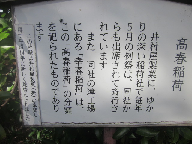 この神社はJR・近鉄線路脇にあって、車窓からも御厨神社の大きな文字が目立つので、アクセスの際に迷うことはないかと思います。境内はそれ程大きくはなく、本殿もこじんまりとした風情でした。この本殿向かって左手には、赤鳥居が目前に建つ高春稲荷というのがあって、ここはあの三重県が誇る菓子メーカー、井村屋製菓に縁の深いお稲荷さんとのことで、津の工場内にある幸春稲荷にはここの分霊が祀られているそうです。同社のスイーツがお好きな方は、是非、会社の今後の発展などを祈願されていかれると良いでしょう。