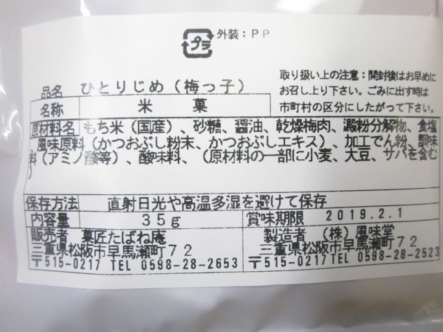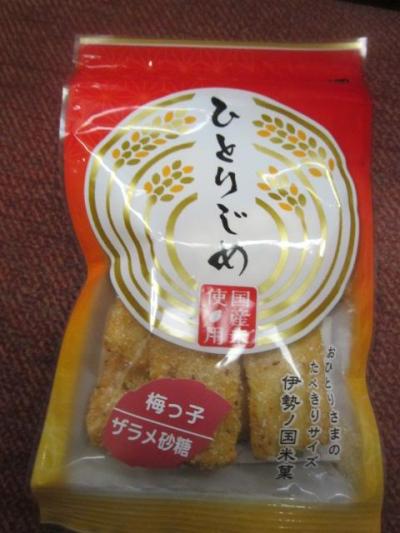 今回は、松阪観光を終えて、プチ打ち上げ的に列車内でビールのつまみ用にと思って立ち寄ったのがこちらのお店です。それ程贅沢は出来ないので、安くて軽く摘めるのを尋ねたら、税込み108円の「ひとりじめ」という小袋の商品を勧められました。ザラメ砂糖が塗された梅風味のあられで、梅の酸味と砂糖の甘さ、醤油の塩辛さが程よく絡んで、とてもビールに合う美味しさでした。