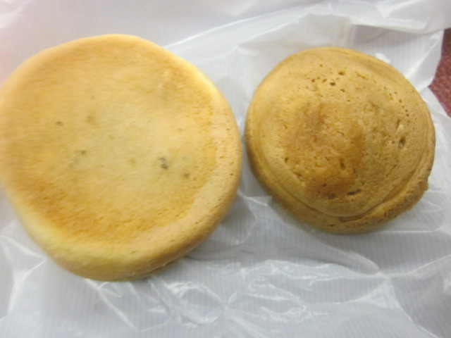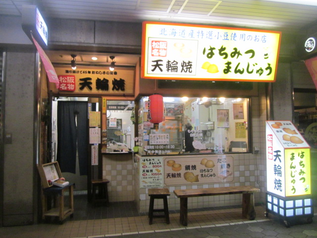 松阪駅前通り沿いの商店街にある和スイーツのお店です。店名がそのまま看板商品となっている天輪焼は一つ105円で、これが一番人気ですが、他に80円のはちみつまんじゅうも人気だとのことで、それぞれを一つずつ購入してみました。
