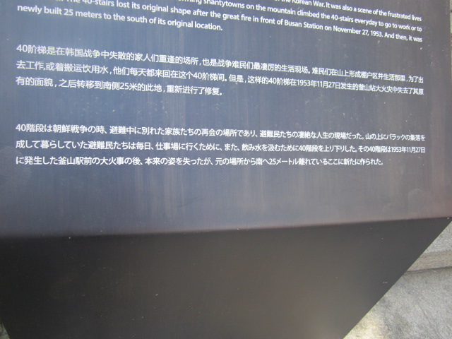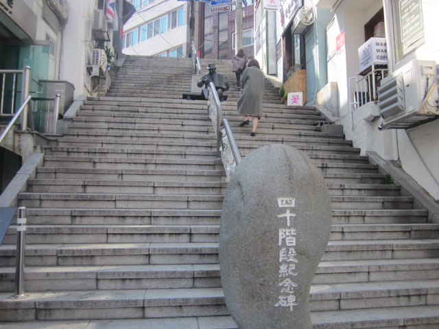 釜山の中央洞にある、色々な趣深い銅像が並ぶ通りの突き当りに、歴史的に重要なスポットとなっている40階段があります。都市鉄道の中央駅からは、山に向かって直進するだけなので、迷うことなくアクセスできます。現代の観光客視点からは、趣のある銅像が並ぶ通りとなっていますが、歴史的には、釜山の悲しい歴史を今に伝える遺産的な価値もあるスポットなので、静粛な気持ちで巡られると良いかなと思います。