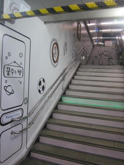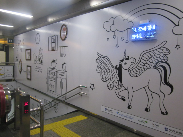 駅構内に注目した場合、ここは美しい壁画が旅心を擽られる駅かなと思います。かつての中央洞駅といえば、やはり旧国際FTの最寄り駅ということもあって、フェリーで釜山に到着した際は、よくこの駅を利用したものですが、そんな時代の名残的な、フェリーをモチーフにしたデザインや、釜山を象徴する椿の花や五六島を描いたものなど、なかなか風情があって、観賞スポットとしてもお勧めできる駅です。- 旅行時期
