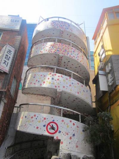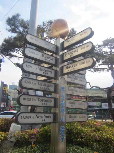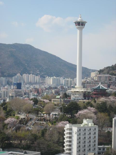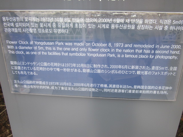 南浦洞の小高い丘の上に広がる公園ですが、都市鉄道の南浦駅側からは、エスカレーターで登ることが出来ますので、何となく、長崎の平和公園を彷彿とさせてくれる風情ですが、その仕様は全く異なっていて、こちらは派手な電飾で彩られた近未来的な雰囲気に圧倒されます。また、公園自体にも見所が多くて、春は桜も綺麗なので、お花見スポットとしてもお勧めできる公園です。あと、地味な見所としてはここには韓国では珍しいという、秒針付きの花時計が設置されていたりするので、話のタネに是非確認してみて下さい。