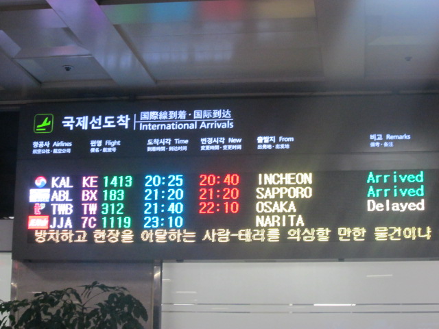 近年、日本からの直行便も急速に増えている感のある大邱国際空港ですが、今回は新千歳発の直行便でこちらに到着しました。到着時刻が21時半頃と遅かったため、両替対応が気になりましたが、一応、到着ロビー内、入国通路から向かって右手突き当りにある大邱銀行の窓口が開いていて、日本円を韓国ウォンに両替することが出来ました。