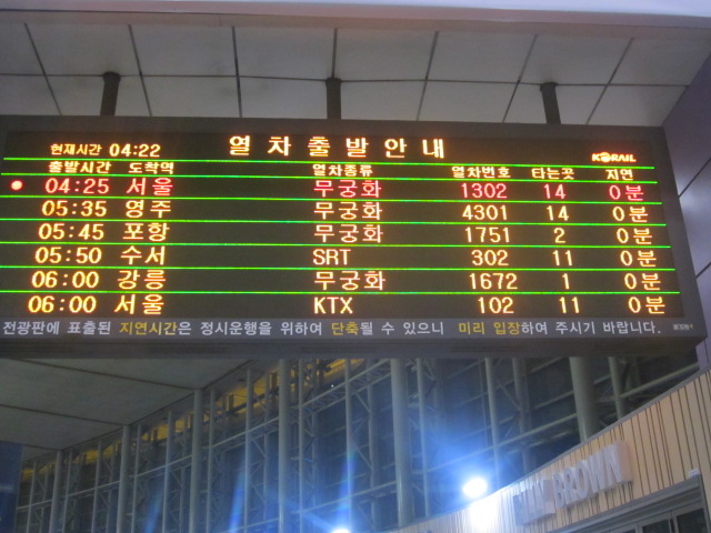 私は午前5時45分に出発する慶州行き(正確には浦項行きですが…)のムグンファ号に乗車しましたが、この駅始発の列車でしたので、5時20分頃には車内に入ることが出来ました。始発列車に乗車される場合は、大体出発時刻の20分位前を目途に足を運ばれると良いかなと思います。