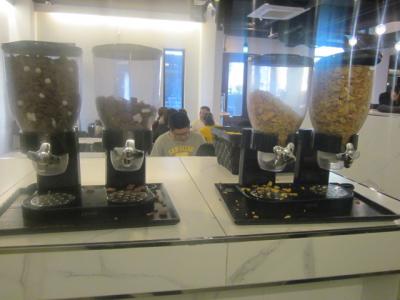 あと、このお値段でありながら、無料朝食が付いています。私は最初8時過ぎに行ったのですが、混雑していたので、一旦戻って再度9時過ぎにアクセス。最初は食パンが用意されていたのですが、後半はそれがなくなったためか、袋入りラーメンが用意されていました。それとは別に、シリアルと牛乳も用意されていて、シリアルに関しては、米国のエアラインラウンジなどでよく見かけるような、回転式のダイヤルをひねると落ちてくるタイプで、こちらは十分な在庫があるので、遅い時間帯でも頂くことが出来ました。案外、このシリアルも美味しくてお勧めです。