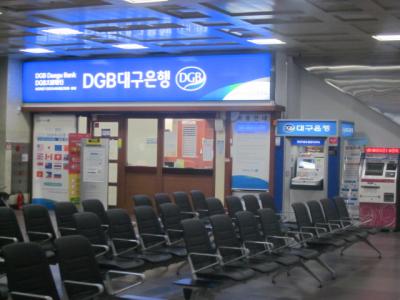 夜なので、レートが悪いかもと半ばあきらめモードで3000円だけウォンに両替しましたが、思ったより高レートでした。ただ、窓口の脇に設置されている大邱銀行のATMだと、手数料が取られます(一応、ATM画面をキャッシング直前まで進めてみましたが、最終画面で50000ウォンの両替に対して、3600ウォンの手数料徴収の旨が掲示されたので、ここでのキャッシング手続きはキャンセルしました。)