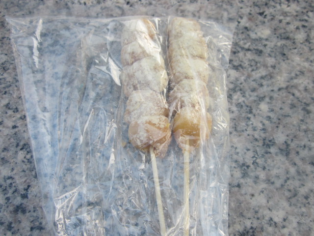 今回は2018年末の旅で、行列のために食べ損ねたこちらの御団子屋にリベンジに出かけました。前回は年末ということで混雑していたのだと思われますが、実は今回訪問してみて気付いたのですが、2019年1月から1本75円(従来は70円)に値上がりしていました。もしかするとあの時の行列は、値上がり前の駆け込み需要だったのかな、なんて思いながら、今回は悠々と買うことが出来ました。