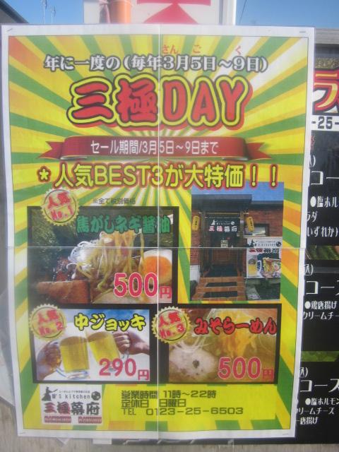 ここの魅力は何といっても、店名に因んで、毎年3月5~9日にかけては、”三極DAY”と称するお店の看板メニューが安く食べられることですが、やはりこれを目当てにかなり混雑します。まあ、安くなるとはいっても、一番人気の焦がしネギ醤油ラーメンや三番人気の味噌ラーメンが500円になる程度、ですので、ゆっくり食べたい方は、倍ほどの金額を払ってこの日以外に訪問されるのが良いかもしれません。因みにここは純粋なラーメン店ではなく、夜間は居酒屋営業となりますので、一風変わったナイトライフを千歳界隈で楽しみたい方にもおすすめできる店舗です。(空港の傍でありながら、ほぼ地元民しか着ていない風情です( ´∀` )。)