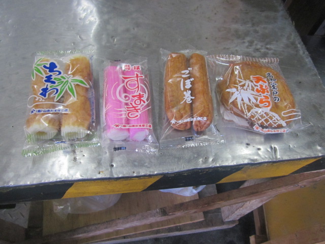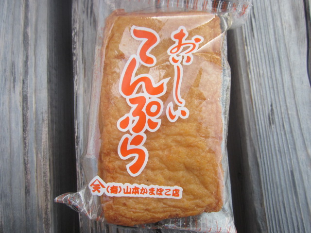 室戸の市街地に、工場兼店舗という感じで何気なく建っている蒲鉾屋さんですが、ここの蒲鉾は取り敢えず食べておいて損はないと思います。スーパーなどでも商品は販売していますが、やはり雰囲気を味わうためにも、市役所の斜め向かい辺りにある工場兼店舗まで直接買いに行くと良いですね。スタッフの方が幾つかの商品を並べて見せて下さり、その中から今回は、商品名もズバリ、「おいしいてんぷら」というのをチョイス。3枚入って194円というお値段でしたが、なかなか食べ応えがあって、もちもちの食感に腹持ちも良く、満足のいく一品でした。