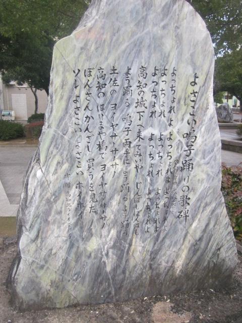 高知市内で一番賑やかな繁華街としてお馴染みの帯屋町アーケードと電車通りとの狭間にある、都心部の公園としては市内でも有数の規模を誇る公園で、街歩きに疲れた際の休憩の場としてお勧めできるところです。ただここは、屋根がある区画がないので、雨の多い高知においては、雨が予想される際はアーケード内の店舗などに逃げ込む方が良いかもしれません。オープンスペースが広がっている印象の中で、片隅にはシブい見所が幾つかあります。一番有名なのは立志社跡を示す石碑だと思いますが、他にもよさこい鳴子踊りの碑等も、話のタネに押さえておかれると良い、ユニークな記念碑かなと思います。