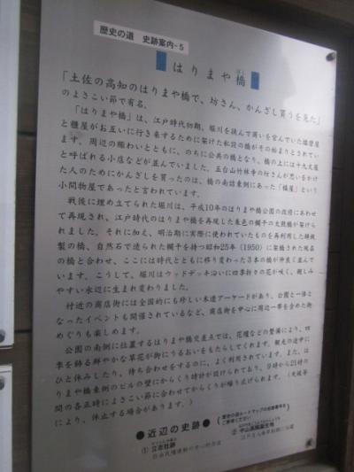 高知観光の際には、誰もが訪問される高知を代表するランドマーク的存在のはりまや橋ですが、日本三大がっかり、という汚名に代表される通り、何となくネガティブな印象が残ってしまうのは残念に感じますね。でも具にこの橋を眺めてみると、新しい時代においても色々と建て替えしていたり、そんな歴史を物語る解説板が付されていたりと、ゆっくりと眺めれば眺めるほど、それ程ガッカリ名所でもないのかな、という印象が強くなってきます。是非、目の前の小さな朱塗りのはりまや橋だけを眺めてがっかりするのでなく、周辺全体を散策してみて、包括的にこの橋の魅力を捉えるように心掛けてみて下さいね。