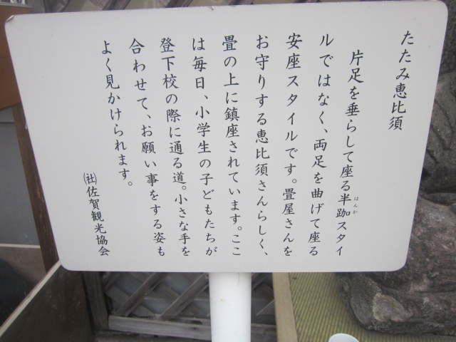 現在の佐賀市内では、観光スポットのみならず、普通のお店や寺社の片隅などに沢山のえびす(佐賀では恵比須と表記するらしい)様の姿を拝むことが出来ます。それぞれに解説板が付されていて、ユニークな方が多くいらっしゃるので、ビジュアル的に楽しいですが、ここで開催されているスタンプラリーの八十八か所巡りは、スタンプの運用が場所により様々で、時間外だと押せない(お店の人が預かっているとか)ところがある一方で、いつでも押せるように置きっぱなしになっているようなところもあって、スタンプ管理に統一性がない感じなので、きっとスタンプラリーとして参加してしまうと、訪問したのにスタンプが押せない、といったスタンプを感じることが多いと思うので、あまりお勧めは出来ないと思います。適当に巡って、ビジュアル的にユニークなお姿の各所のえびす様を楽しむ、というのが、頻繁には佐賀に立ち寄れない観光客的には正しいスタンスのように感じました。