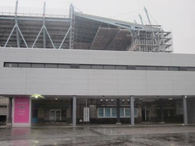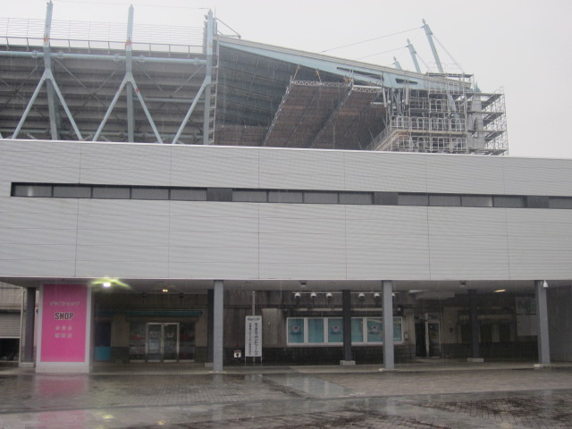 JR鳥栖駅から跨線橋を越えた反対側にあるのがこちらのスタジアムで、Jリーグのサガン鳥栖がホームグラウンドとして使用している施設です。Jリーグの本拠地は、立地的に鉄道駅に直結しているということは案外少ないように感じますが、ここはとても便利な立地ですね。ただ、ゲートまでの通路を実際に歩いてみましたが、雨を避ける箇所がないのはちょっと大変に感じますね。雨天でも試合開催することが多いサッカーの本拠地としては、せっかく駅直結なのだから、屋根付きの通路を確保したら良いのにな、と、ちょっと余計なことを考えてしまいました。