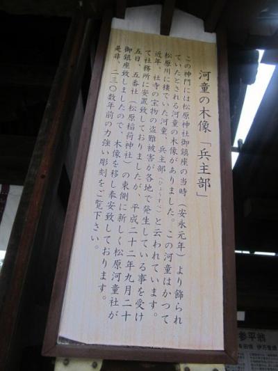 また、ここのユニークな”秘神”としては、河童がモチーフとなっている兵主部(ひょうすべ)と呼ばれる木像が安置されています。元々は社務所にいらしたそうですが、何年か前に全国各地の寺社で、秘仏などの盗難事故が相次いだことを受けて、新たに松原河童社を設けて、より懇ろに安置されるようになったとのことです。河童社の方で230年前の作という、力強い兵主部のお姿を拝むことが出来ます(勿論、撮影は禁止)ので、是非ご覧になってみて下さい。- 旅行時期