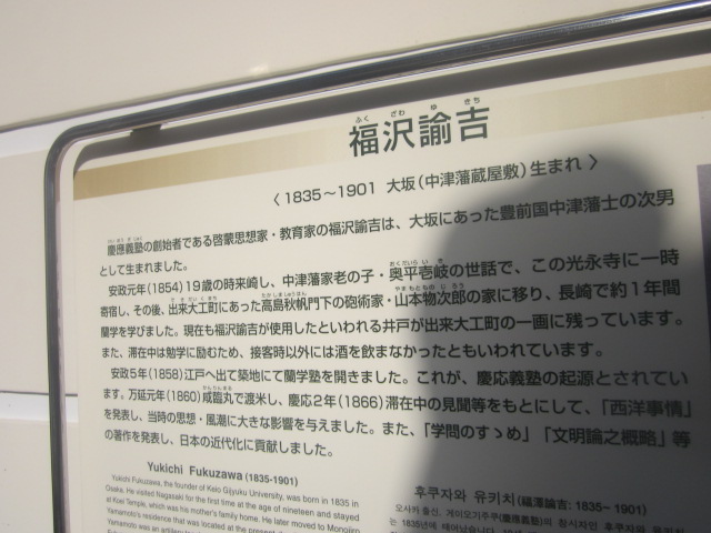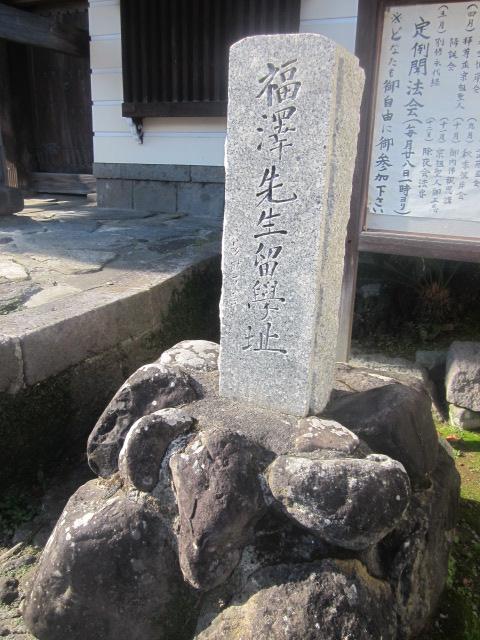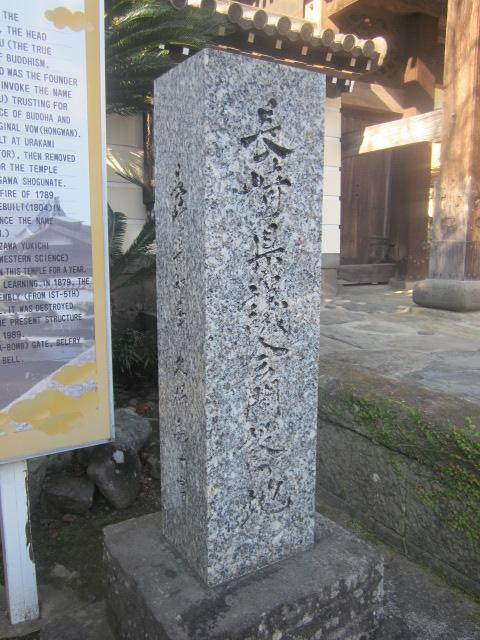 長崎を代表する観光地の一つ、眼鏡橋から中島川沿いに遡った右岸側、一覧橋と古町橋の間位にあるお寺です。お寺自体は境内も小さくて、それ程見所がある訳ではありませんが、ここは何よりもあの有名な福沢諭吉が、一時期蘭学を学ぶために寄宿していたこともあるそうで、それを示す碑と解説板が入口脇に建っていますので、こちらも是非ご覧下さい。