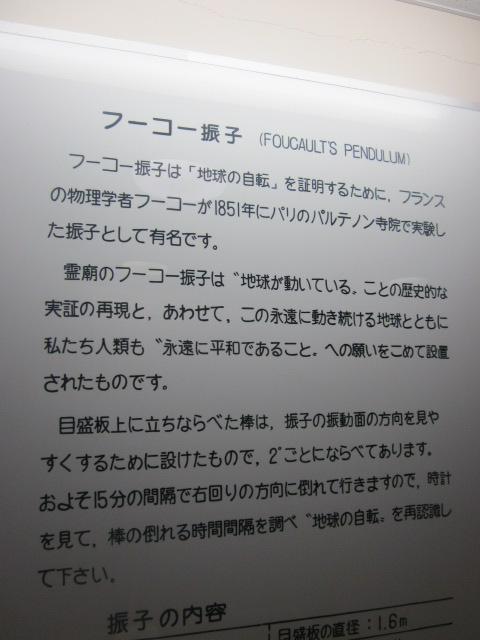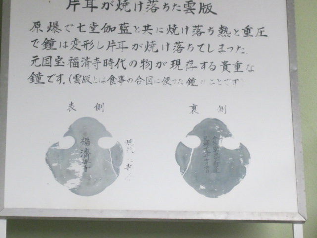 尚、このフーコーの振り子は地下にありますが、そこに続く通路の上部に、原爆で焼け残った、国宝時代の福済寺の片耳が焼け落ちた雲版、という貴重な展示も見られますので、こちらも是非お見逃しなく…。