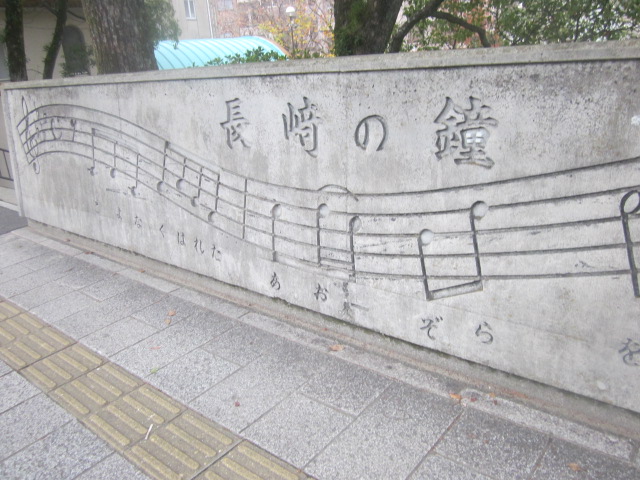 浦上天主堂のすぐ向かい側にある小公園で、雰囲気としては完全に地元の方向けの風情の公園なので、観光客的視点からは、見所は少ないかと思います。ただ、浦上天主堂側の外壁のデザインが、音符も描かれた「長崎の鐘」のメロディを表象するものとなっていて、携帯できる楽器を演奏される方は、これを見ながら演奏してみる、なんて過ごし方も楽しいかなと思える公園です。