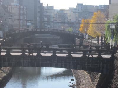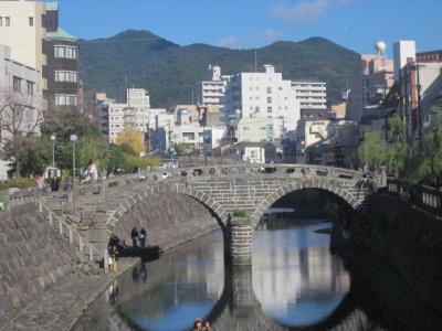 長崎を代表する観光地の一つ、眼鏡橋の眼鏡らしい風景を楽しむのに最適なのがこの橋です。橋自体は割と平坦で立体感もない橋なので、現代の観光客的には見所は少ないかと思いますが、やはりここでは眼鏡橋の展望台としての側面が一番注目されるべきだと思います。眼鏡橋からは少し距離がありますが、その間に飛び石ゾーンなどもあって、実際に危なっかしい仕草で歩いてここを渡っている方や、12月なのに水遊びに勤しむ子供達等を眺めながら、ほのぼのとした気持ちにもなれるのが良かったです。