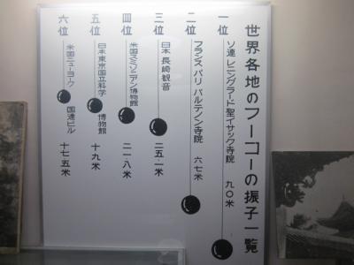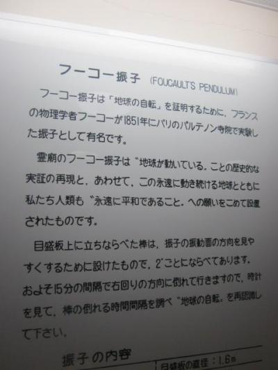 このお寺のもう一つの見所として、世界で二番目の規模を誇るフーコーの振り子、というのがあって、世界最大のはロシアにあるそうです。示唆的に見えたのは、米国DCのスミソニアンにあるフーコーよりは大きい、ということを示したフーコーの振り子規模順位表、みたいなので、さりげなく、原爆を投下した国に対する対抗意識なのかな、と感じました。