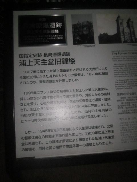 浦上天主堂は、原爆の爆心地から近いこともあって、壊滅的な被害を受けた教会建築の象徴として知られていますが、その中でも、原子爆弾落下中心地碑のすぐ隣に移設された遺壁と共に、貴重な遺構として知られているのがこちらの鐘楼で、再建された現在の浦上天主堂建物のすぐ下部にあります。道標も整備されていますので、それに従ってアクセスすると良いです。私は暗くなってからの訪問でしたので、はっきりとした姿で拝むことはできませんでしたが、それでも痛々しい姿で残存している旧鐘楼の姿を、フラッシュ撮影越しに確認することが出来ました。当時の姿を当時の場所のままで伝えている遺構として、極めて貴重なスポットであることは間違いありません。