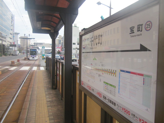 今回は、西坂公園の見物を終えて、長崎駅前に戻るよりもこちらの電停に下った方が早いなと地図を見て判断して、ここから平和公園方面に向かう電車に乗ったのですが、流石に長崎駅前から乗車された方が多い時間帯で、ただでさえ狭い車内は大変なことになっていました。危うく乗車拒否されてしまいそうなほどの混雑ぶりでしたが、乗車口付近にいらした親切な方がきちんと場を作って下さり、何とか乗車することが出来ましたが、やはり、長崎駅前から平和公園方面に向かう観光客は多く乗車しますので、この駅からは日中時間帯には北方向への乗車は控えた方が良いかなと思います。