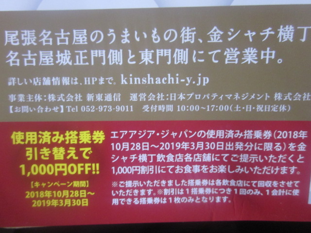尚、2019年2月現在で、DJではキャンペーンを開催していて、搭乗半券を名古屋城傍の金シャチ横丁の各店舗にて、1000円分の金券として利用することができるようになっています。キャンペーン対象期間は2019年3月30日搭乗分(利用も同日まで)となっていますので、この日までにDJ便ご搭乗の際は、搭乗半券を持って金シャチ横丁に足を運んでみて下さい。(因みに、搭乗半券は回収されてしまいますので、DLのニッポン500マイルなどは先にファックスしてから利用するようにして下さい。)- 旅行時期