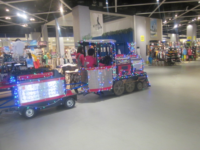 今回は、セントレア到着後に無料バスでイオン常滑まで足を運びました。土曜日ということもあって、駐車場を含めて店内はかなり混雑していましたが、店内には、電飾で彩られたユニークな汽車が走行していて、子供達が大歓声を挙げていました。基本的には休日の運行となるようですが、タイミングが合えば、特にお子様には喜ばれるイベントだと思いますので、是非乗車してみて下さい。