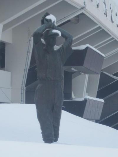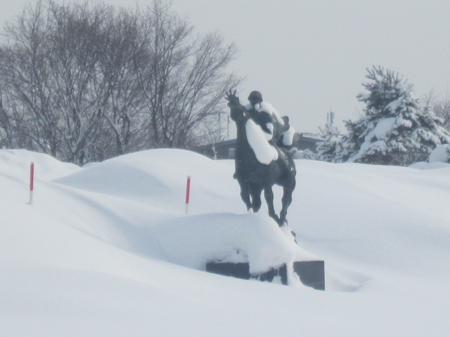花咲スポーツ公園の国道40号線に面するメイン入口通路の向かって左側に設置されている像で、積雪期以外に眺めると、とても疾走感があって見応えがある作品なのですが、今回は2月上旬に訪問してみてびっくり、メイン通路自体が除雪されていないこともあって、完全に雪に埋もれてしまって、タイトルとは裏腹に、夢も希望もない、といった悲しげな風情でした。