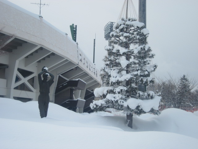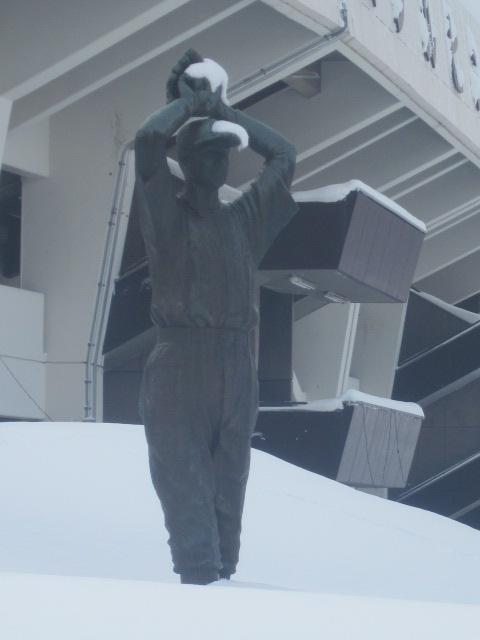 基本的に、プロ野球も開催される程、道北では一番規模の大きな球場ですので、この像を訪問される方も春~秋にかけてのシーズンがメインだと思いますが、ここでは敢えて冬のスタルヒン像について…。スタルヒン球場の冬は、地元では子供向けの遊び場として開放されていることでも有名なので、球場名にもなっているこちらの方の像も、それなりにきちんと管理されているのかなと思って見てみましたが、案外野晒し状態なんですね。ワインドアップの投球スタイルが美しい、投手らしい像だとは思いますが、足元は雪に埋まってしまっていて、まるで雪原のマウンドのような風情、ある意味冬らしい光景だとは思いますが、球場の顔的存在の像なので、もう少しきちんと除雪してあげたら良いのにな、と、ちょっと余計なことを考えてしまいました。