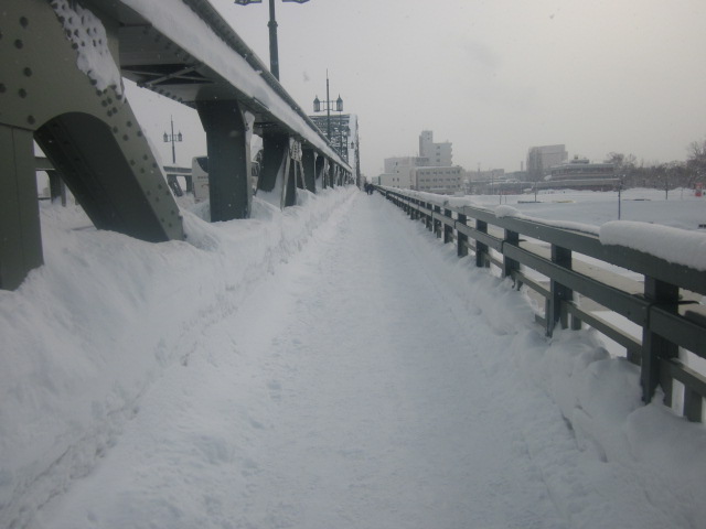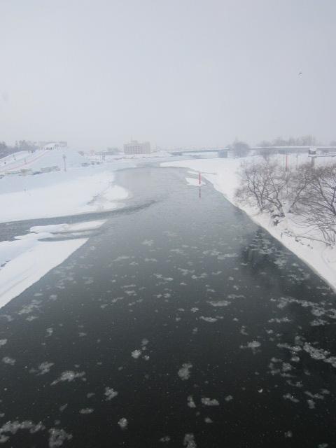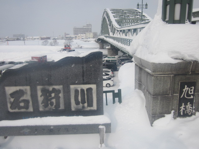 今回は、旭川冬まつり見物のため、旭橋河畔の会場へ、国道40号線沿いに護国神社方面から旭橋を渡ってアクセスしました。日中でもマイナス10度近くという厳しい冷え込みの中で、橋から石狩川の水面を見てみると、”プチ流氷”みたいな感じで、細かい氷が浮かんで流れている様子が見られて、とても幻想的な雰囲気でした。冬まつり名物の大雪像も、この橋の途上から眺めると、丁度大雪像の上り部分のスロープが真正面に見られて、この大雪像の大きさを更に実感できるかと思いますので、是非、冬まつり見物の際には、橋の途上からも、冬まつり会場や石狩川の景観を眺めてみて下さい。