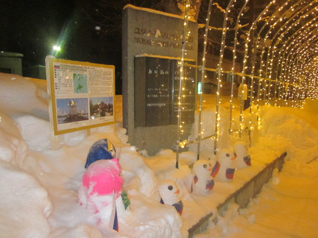 数年前に場所が少し移動して以来、より目立たなくてしまったように感じておりましたが、今回は像の奥(買物公園通側)の緑道沿い、丁度、ユジノサハリンスクとの姉妹都市提携記念碑が設置されている前あたりに、イルミネーションのトンネルが設置されていて、この像も少し目立つ感じのアングルで撮影することが出来ました。
