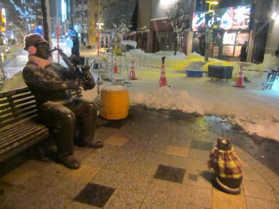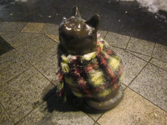 雪国の人物像などでは結構ありがちな話だと思いますが、冬季にマフラーやニット帽、耳当てなどを着用した姿を見て、ほっこりとした気持ちになることがあります。今回はこの旭川の買物公園通りのシンボル的な、サックス吹きのおっさんと猫の像を通りすがりで眺めてみると、おっさんの方は、ピンクの耳あてにピンクのマフラー、猫ちゃんの方にも、上半身をすっぽりと包み込む外套を着用していて、誰がこういうことやっているんだろうなぁ~、なんて、ちょっと笠地蔵の昔話などを思い出しながら、作ってくれた人に幸あれ、と願いつつ、温かい気持ちになって像を眺めることが出来ました。