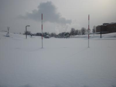 今回は、和寒から旭川までバス移動する際、渋滞に巻き込まれてなかなか進まないのに待ちきれなくなって、途中で下車して歩いていきましたが、その際にこの公園の脇も通過しました。駐車場は緊急時の避難場所に指定されている公園ということもあってか、大々的に除雪されている一方で、正面の広々とした通路は全く除雪されておらず、赤白のポールも立てられていたので、冬の間は全然除雪していない風情でした。