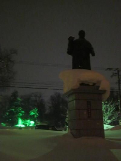 今回は、旭川冬まつり見物の帰る道すがら、常磐公園を経由して旭川駅へと向かいましたが、その入口にあるのがこちらの像です。旭川開拓の時代における重要な人物の像ですので、冬まつり期間中は、ライトアップされているかなと期待して眺めていましたが、近くの常磐公園の石碑はグリーンに輝いていた一方で、この碑に対しては全く照明も当たっておらず、知らない方は気付かずに通り過ぎてしまう程の暗い風情でした。