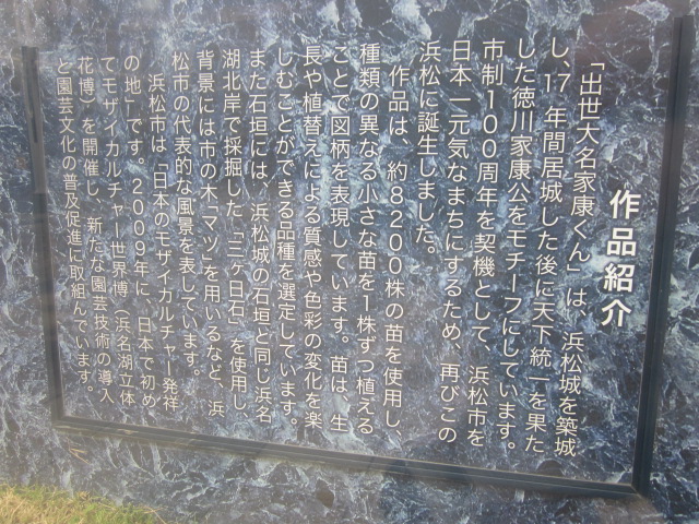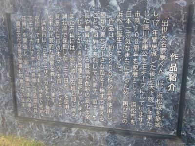 浜松駅の表玄関ともいえる北口側に威風堂々と立っているのがこちらの家康くんオブジェで、被写体として映えるので、記念撮影に良いスポットだと思います。ただ、実はこのオブジェ、結構製作には拘りが見られますので、細部を具にご覧になると、モザイカルチャーの意義も含めて、とても勉強になるオブジェかなと思いました。