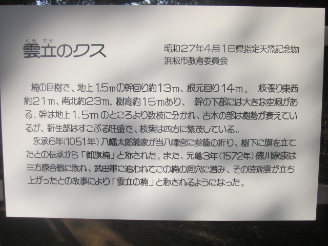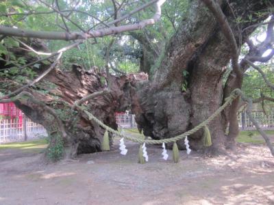 遠州鉄道の八幡駅から徒歩3分位の近距離にある浜松八幡宮の境内、本殿向かって右手に立派な大楠があります。由緒に関しては、解説板を確認して頂きたいと思いますが、その根元の大きな空洞が、老樹としての存在感を示していて、個人的には、少し前に見たばかりの紀伊田辺・闘鶏神社の大クスのことも思い出しながら、どっちも甲乙付け難いご神木だなあと、その姿に圧倒されてしまいました。