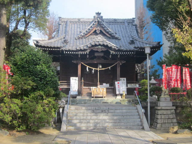 遠州鉄道の遠州病院前駅から徒歩で2分ほどの近距離にある神社です。境内は小さくて、ビルの狭間にひっそりと佇んでいる風情なので、直前まで、本当にお稲荷さんなんてあるのかな?という雰囲気でした。
