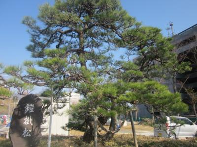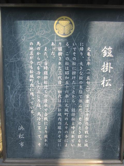 浜松城を見上げる南側のちょっとした広場の一角にひっそりと生えているのがこちらの松で、家康が三方原の合戦の帰り道に鎧を掛けて休憩した松、ということですが、場所としては色々と伝承があるようで、まあ、正直言ってしまえば、胡散臭い感じは否めない松だと思います。ただ、そういった歴史的な経緯はともかくとして、この辺りから眺める浜松城の景観はなかなか素晴らしいので、城をバックに松を撮るといったアングルは、なかなかSNS映えする写真になるかなと思まいます。