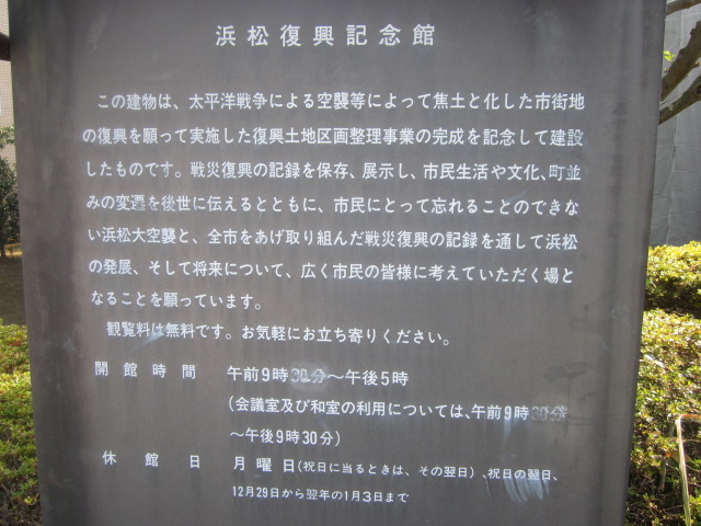 4トラさんのサイトを見ていると、どうでも良いようなコンビニとかが沢山登録されている割には、重要な施設の登録が抜けていたりして、何だかなと思うことがよくありますが、ここでも後者に該当する施設として、浜松復興記念館のことを記させて頂きます。