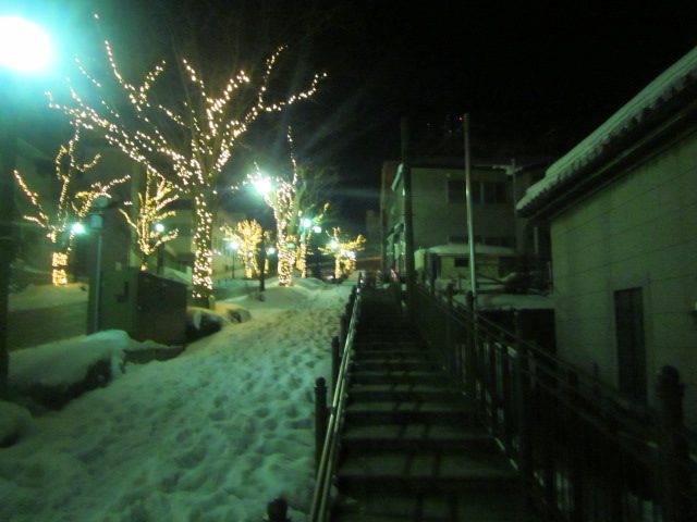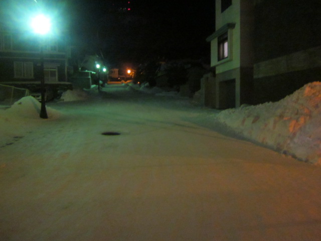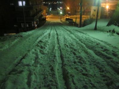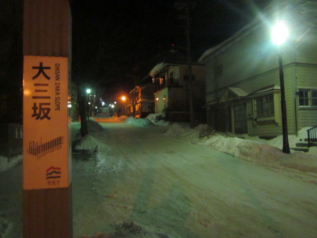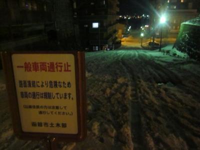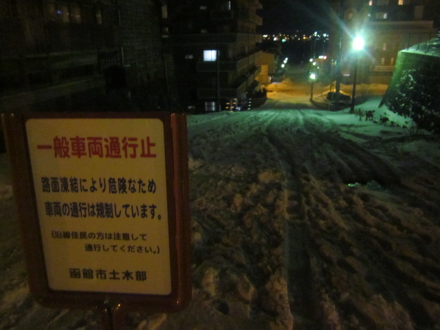 今回は夜の元町散策を終えて、最後にこの坂を下って最寄の末広町電停へと向かいましたが、正直、冬の夜のこのルートはあまりお勧めではないです。雪の状態にも依るかと思いますが、特に弁天末広通りから電車通りに下るこの坂沿いは鋭角で、しかもロードヒーティングはされておらず、雪質もグチャグチャで非常に歩き辛かったです。ここは一般車両の通行も禁止されている分、通常の道路向けの除雪も入らない状況なので、歩行者の通行は禁止はされていませんが、他に代替の坂がある以上は、やはり進んではお勧めできない坂だと思います。