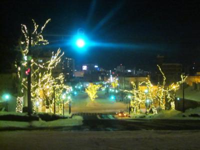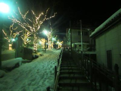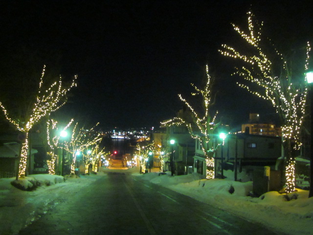 函館を代表する観光エリアの元町界隈の中でも、二十間坂と並んで著名な坂の一つだと思いますが、今回は初めて夜間に訪問してみました。するとここも二十間坂と同様、沿道の木々が美しくライトアップされたイルミネーション空間となっていて、とても幻想的な雰囲気を楽しむことが出来ました。