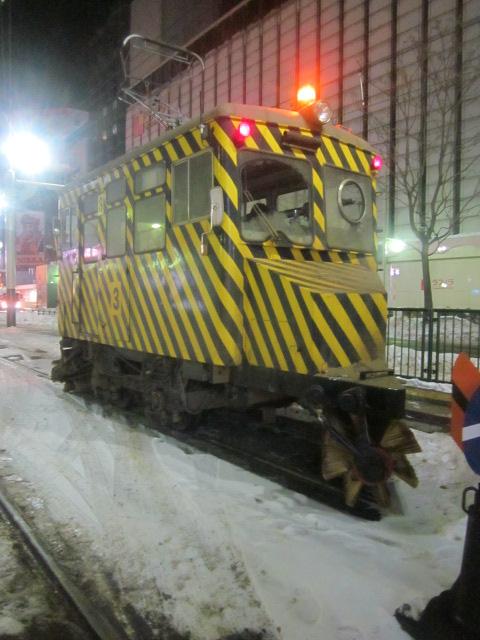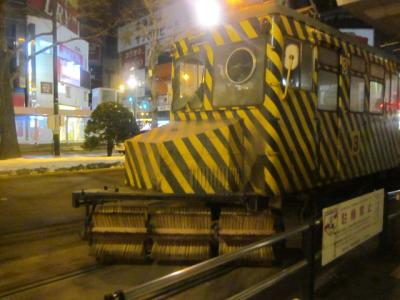 札幌市電の冬の風物詩としてお馴染みのササラ電車ですが、今回は早朝にバスですすきのに到着した際に、すすきの電停傍で待機しているササラ電車を見かけました。