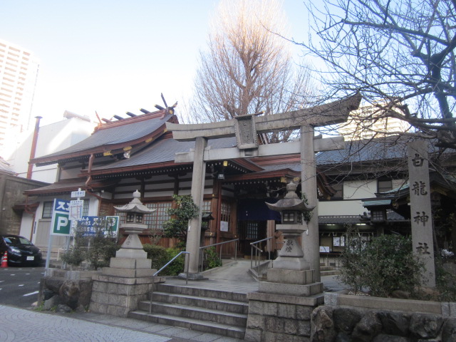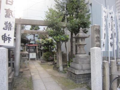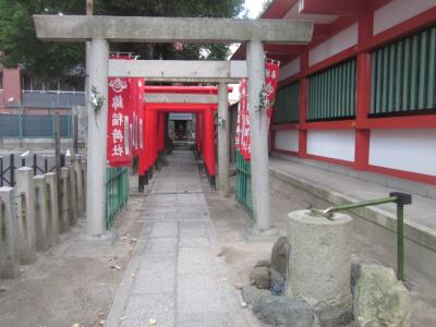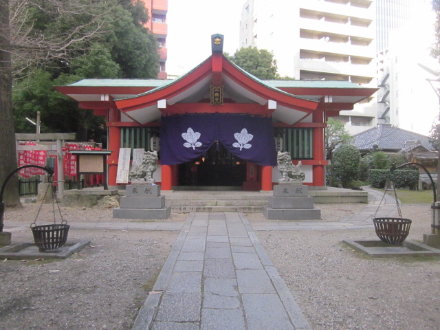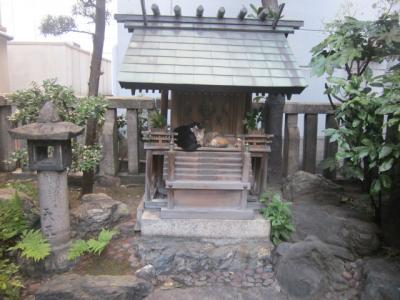 笹島交差点からすぐ南東側のビルの狭間にある小さな神社です。雰囲気としては、都会のオアシス、というより、神社が縮こまって見えてしまう程の可哀そうな風情に思えてしまう規模です。私の訪問時は、小さな祠の上に何か動いていると思ったら、何と二匹の猫が体を寄せ合って、寝そべっていました。