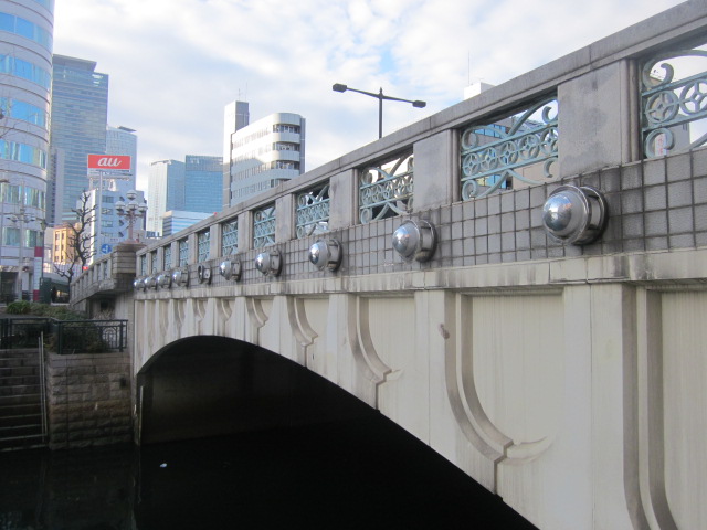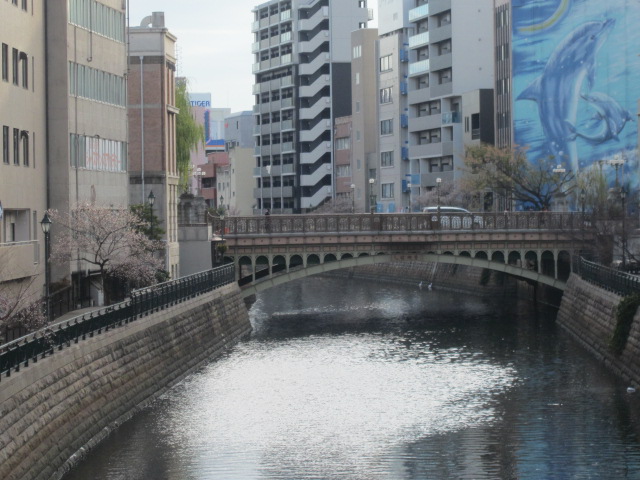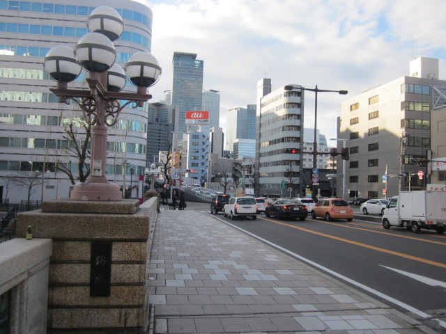 名駅からは徒歩5分程度の近距離、文字通り錦通り沿いの堀川に架かる橋です。名古屋を代表する通りの一つに架かる橋なので、勿論橋の幅も広くて、道路を走行している際は、橋であることを気づかないレベルかもしれません。歩道が広々としているので、安心して河畔の景観を楽しむことが出来ますが、特にここから南方の納屋橋を眺める風景は、名古屋らしさが感じられると思います。私は1月上旬の訪問でしたが、まだ納屋橋側の何本かの木に、開花している四季桜(冬の見頃は12月、勿論本当の桜の時期(3月下旬~4月上旬)にも開花します)の姿を確認することが出来ました。